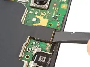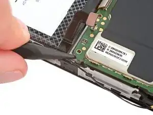 Плоским концом лопатки подденьте и отсоедините пресс-разъём кабеля дисплея рядом с кабелем аккумулятора.