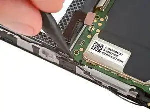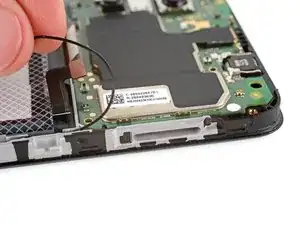 Поместите один из захватов пинцета под металлический шейку разъёма чёрного антенного кабеля вблизи правого верхнего угла материнской платы.