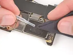 Подденьте одной лапкой изогнутого пинцета металлическую втулку коаксиального антенного кабеля платы антенны.
