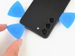 Проведите лопаткой к нижней части рамки камеры, чтобы разрезать левый клей.