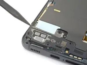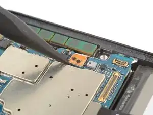 Используйте острый конец лопатки, чтобы поддеть и отсоединить пресс-разъём фронтальной камеры.
