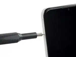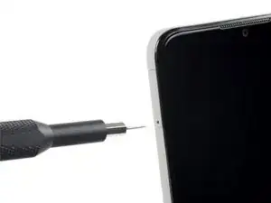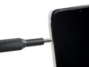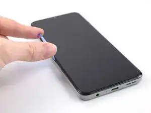 Вставьте инструмент для извлечения SIM-карты, биту или выпрямленную скрепку в небольшое отверстие на лотке SIM-карты в верхнем левом углу телефона.