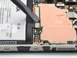 Используйте плоский конец лопатки, чтобы отключить шлейф батареи, отжав разъем прямо вверх от разъёма.
