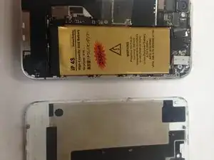 Телефон откроется, и вы увидите металлическую пластину около камеры в верхнем левом углу, а также меньшую металлическую пластину в нижнем левом углу. Их необходимо снять перед извлечением аккумулятора. Для их удаления лучше всего подойдёт крестовая отвертка Phillips #000.