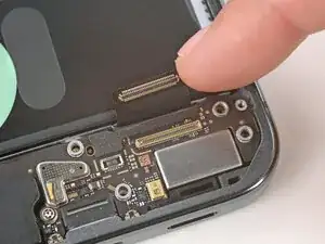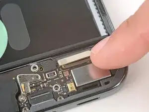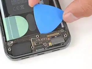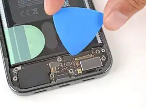 Используйте лопатку, чтобы поддеть и отсоединить оба нажимных разъёма межсоединительного кабеля — один на плате USB‑C и один на материнской плате.