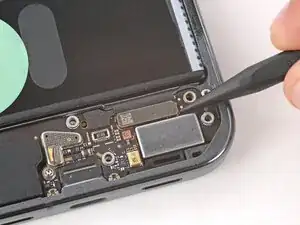 Вставьте кончик монтажной лопатки под центр верхнего края платы USB‑C так, чтобы он оказался между платой и металлической кромкой рамки.