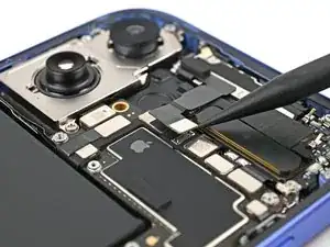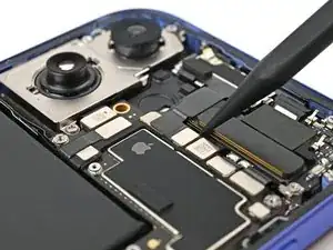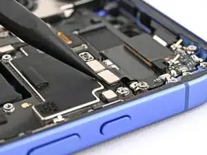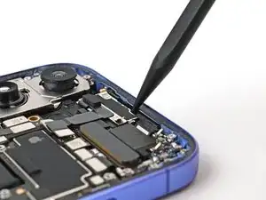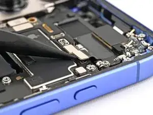 Используйте изогнутые пинцеты, чтобы захватить чёрную вытяжную ленту в правом нижнем углу антенны 5G mmWave.