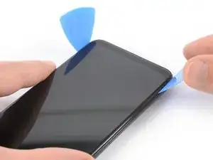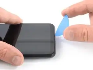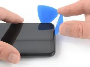 Проведите открывающей лопаткой по нижнему левому углу, чтобы освободить пластиковые зажимы, удерживающие заднюю крышку на месте.