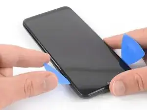 Проведите открывающей лопаткой вдоль правой стороны телефона, чтобы освободить пластиковые зажимы на правой стороне задней крышки.