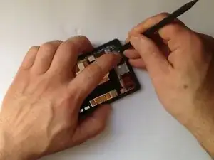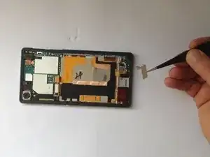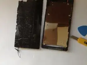 По краям телефона и между аккумулятором и задней крышкой есть клейкая лента. Я нашёл маленькую язычок внутри верхней части крышки, который позволил снять клей и освободить заднюю панель от аккумулятора. Это та же разновидность клеевой полосы, что используется в iPhone 5/5c/5s.