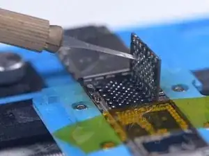 Далее рассмотрим выпаивание крупных микросхем термовоздушным пистолетом. При работе с крупными микросхемами, такими как NAND, необходимо удалить угловой клей. Для выпаивания таких крупных микросхем используется пистолет с винтовым потоком. Наклейте термостойкую ленту вокруг компонента для защиты соседних компонентов.