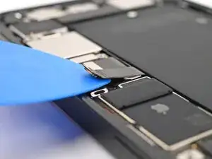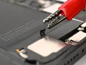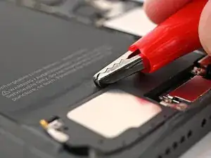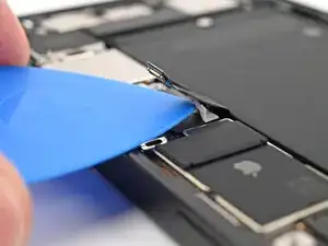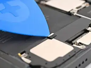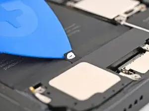 Подвиньте открыватель под кабель аккумулятора, чтобы отделить клей, удерживающий его на плате.