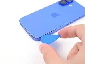 Протяните щуп вокруг нижнего правого угла и к кнопке уменьшения громкости, чтобы отделить клей и освободить металлический зажим.