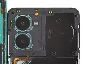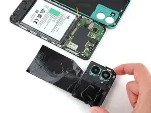 Поднимите заднюю крышку с рамки и переверните ее через левый край телефона, положив крышку на рабочую поверхность.