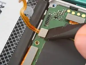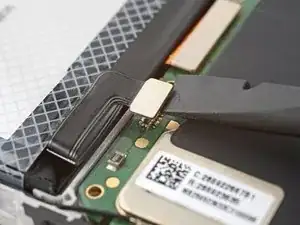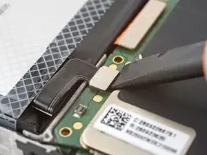 Используйте плоский конец лопатки, чтобы поддеть и отключить соединитель батареи press connector от нижнего края материнской платы.