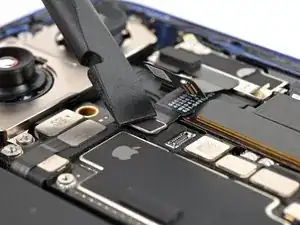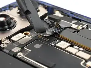 Используйте плоский конец лопатки или палец, чтобы подключить нижний press-разъем передней камеры, затем верхний press-разъем.