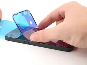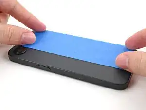 Удерживайте синюю подложку в стороне и совместите клей с нижним краем iPhone.