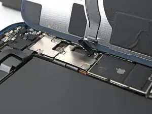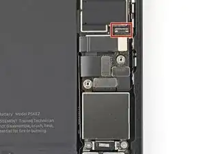Разместите центральную крышку разъёма над прижимным разъёмом катушки беспроводной зарядки так, чтобы она немного выступала в паз на материнской плате для нижней защёлки.