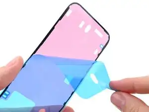 Разместите заменяющий клей поверх рамки так, чтобы более крупная синяя подложка находилась снизу, а язычок для снятия был в правом нижнем углу.