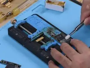 Закрепите сигнальную плату в держателе. Нанесите канифоль паяльником при температуре 365 ℃ и лужёной оплёткой удалите олово с контактной площадки. Удалите олово с контактной площадки логической платы тем же способом.
