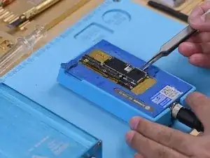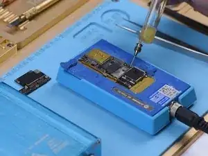 Теперь необходимо заново соединить логическую плату с сигнальной. Прежде всего, нужно перепаять шарики на сигнальной плате. Закрепите сигнальную плату на платформе для перепайки. Установите шаблон для перепайки. Равномерно нанесите слой низкотемпературного паяльного пасты. Снимите шаблон для перепайки.