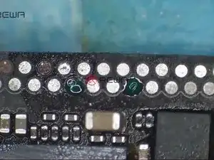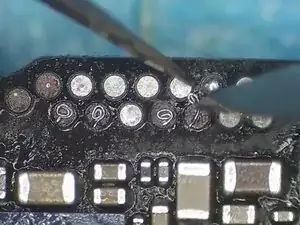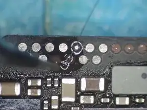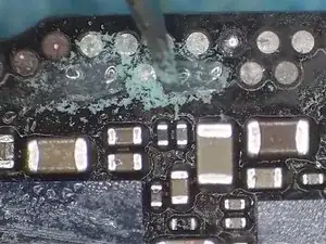 Нанесите немного паяльной пасты на отсутствующие площадки и нанесите припой горячим феном при 340 °C. Очистите контактную площадку очистителем плат и нанесите немного флюса-пасты.