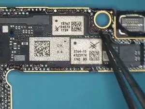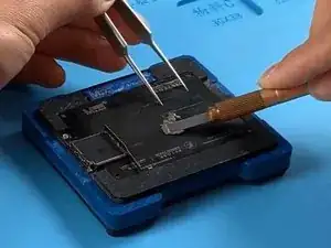 Зафиксируйте плату логики в держателе и удалите припой с контактной площадки паяльником при 365 °C и плеткой для удаления припоя.