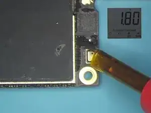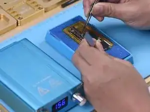 Судя по кодам ошибок iTunes и их анализу, неисправность может быть вызвана повреждением NAND‑памяти или неисправностью цепей, относящихся к NAND. Начнём с измерения питания NAND. Подключите разъём батареи к источнику постоянного тока. Включите питание материнской платы при помощи пинцета.