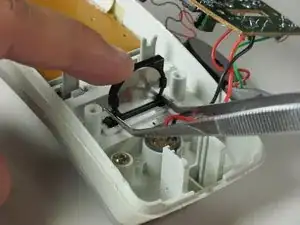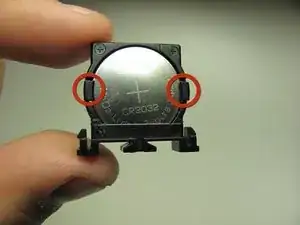 Используйте пинцет, чтобы надавить на защёлки держателя аккумулятора.