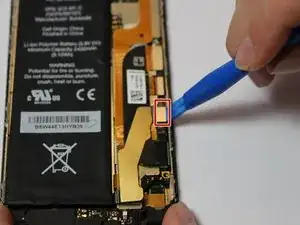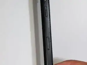 Используя инструмент для открывания, отключите шлейф кнопки громкости от основания телефона, освободив две половинки устройства.