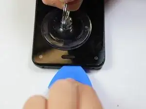 Приподнимая присоску, вставьте лопатку в щель между экраном и задней крышкой, чтобы аккуратно поддеть экран.