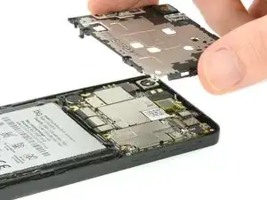 Вставьте плоскую сторону лопатки между экраном защиты материнской платы и рамой телефона.