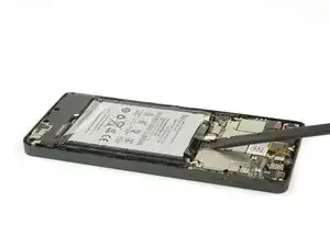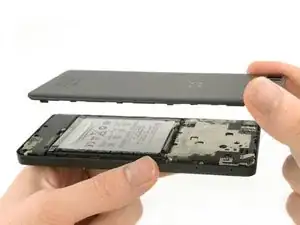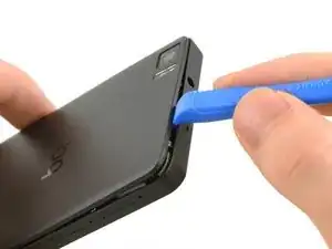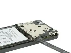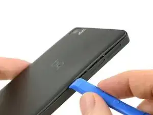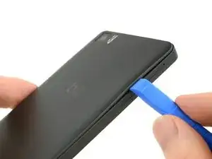 Вставьте наконечник инструмента для раскрытия iFixit между задней крышкой и средней рамой телефона.