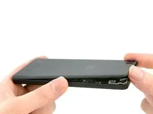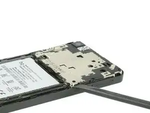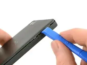Проведите инструментом для вскрытия к нижней части телефона, чтобы выщелкнуть пластиковые защёлки, соединяющие заднюю крышку и среднюю раму.