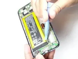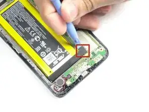 Используйте синий пластиковый инструмент для открытия, чтобы поддеть аккумуляторный блок из телефона. Подденьте сторону, противоположную материнской плате, так как это может повредить материнскую плату.