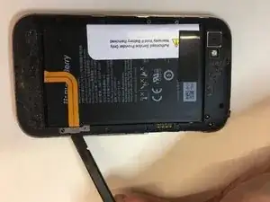 Когда все фиксаторы по краю крышки будут отпущены, используйте медиатор, чтобы разрезать клей, находящийся сверху и снизу крышки. Будьте внимательны, чтобы не повредить ленточный кабель аккумулятора. Верхний клей находится под стеклянной панелью на задней крышке. Может потребоваться нагрев.