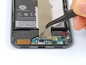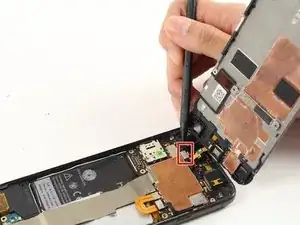 Используйте лопатку, чтобы аккуратно поддеть разъём шлейфа динамика, установленного рядом с ухом, и отключить его от материнской платы.
