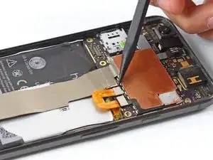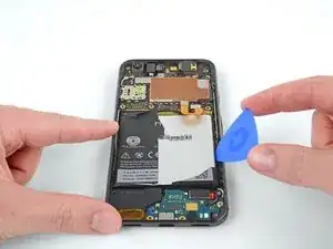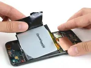 Если аккумулятор не выходит легко, не прилагайте чрезмерных усилий. Нагрейте заднюю панель телефона с помощью iOpener или теплового пистолета, чтобы ослабить клей.
