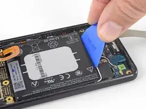 Отведите шлейф платы зарядки в сторону и вставьте медиатор вдоль нижнего края батареи.