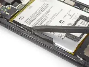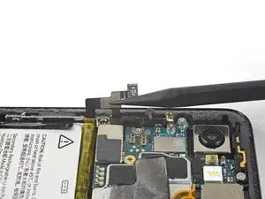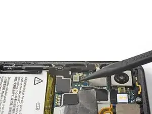 Используйте наконечник лопатки, чтобы приподнять и отсоединить разъём питания аккумулятора от его гнезда возле правого края телефона.