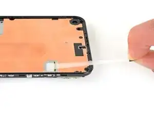 Если какая‑либо клеевая полоса оторвалась и осталась под аккумулятором и её нельзя извлечь, капните несколько капель 90% изопропилового спирта в отверстие соответствующей полосы и наклоните телефон в сторону верхнего края так, чтобы спирт стек к оставшемуся клею. Подождите одну минуту, чтобы клей размягчился, затем переходите к следующему шагу.