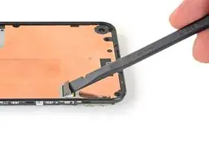 Проведите медиатор вдоль правого края телефона, чтобы освободить пластиковые защёлки, фиксирующие заднюю крышку на средней рамке.