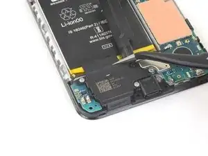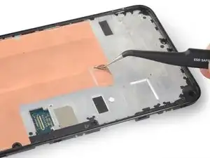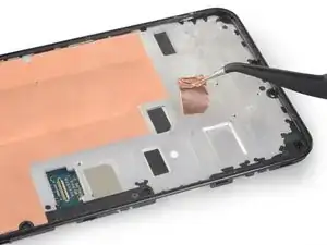 Используйте пинцет, чтобы снять прямоугольный кусок медной фольги, расположенный ближе всего к краю телефона.