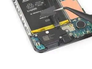 Используйте пинцет, чтобы снять чёрную ленту, закрывающую гибкий кабель антенны между динамиком и аккумулятором.