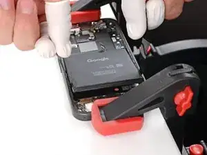 Так как для вытаскивания батареи нужны две руки, вам необходимо прочно зафиксировать телефон на рабочей поверхности.