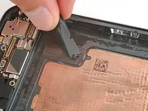 Используйте остриё лопатки, чтобы поддеть и отключить пресс-коннектор антенны mmWave в правом верхнем углу логической платы.