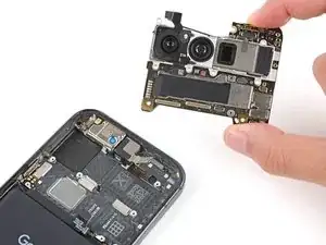Возьмитесь за правую сторону материнской платы и аккуратно вытяните её, следя за тем, чтобы не зацепить кабели фронтальной камеры и батареи.