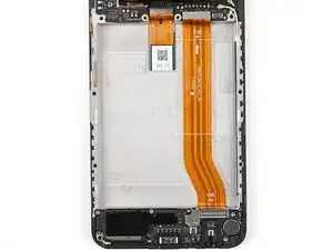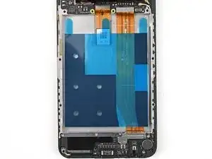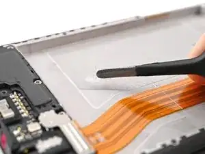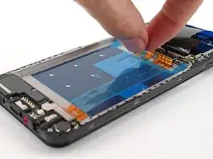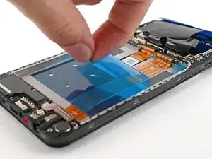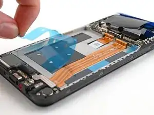 Поднимите заднюю крышку с рамки и переверните её через левую кромку телефона, положив крышку плоско на рабочую поверхность.