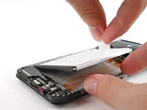Пинцетом или пальцами снимите три полоски клея аккумулятора с рамки.