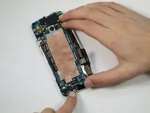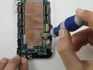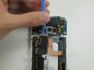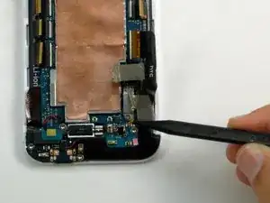 Используя заострённый конец лопатки, потяните провода двигателя вибрации влево, чтобы извлечь разъём из платы.